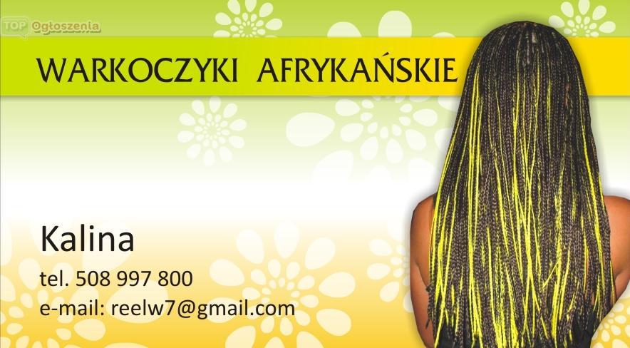 Witaj! Zaplataniem warkoczyków zajmuję się od ponad 9 lat, moje doświadczenie oparte jest na pasji i zaangażowaniu. Do każdej klientki podchodzę indywidualnie wsłuchując się w jej potrzeby i wymagania. Wykonuję od ok. 190 do ponad 220 warkoczyków na całej głowie - w zależności od gęstości włosów. Więc jeśli zawsze marzyłaś o niecodziennej i ciekawej fryzurze wprawiającej w osłupienie Twoich znajomych. Chcesz zaszokować swoim nowym wyglądem innych? Nic prostszego! Warkoczyki afrykańskie z włosów syntetycznych to idealny pomysł na nowe doskonalsze JA!! Cała gama kolorów! Niskie ceny oraz miła atmosfera. Zadzwoń i się przekonaj! tel:508997800, gg: 2989882